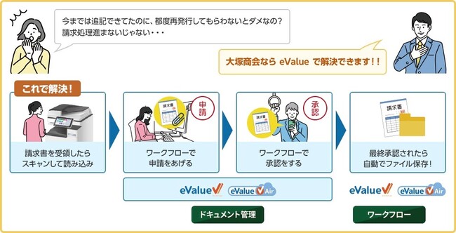 インボイス制度では、受領したインボイスの要件がそろっているかを確認した際に、請求書に不備があっても追記することができません。その都度、再交付の依頼をする必要があります。そこで、活躍するのが「eValue V 2nd Edition ワークフロー」と「eValue V 2nd Edition ドキュメント管理」。受領した請求書の承認作業を迅速に行い、自動で電子保存することで、再交付時に発生する請求処理の遅延を防ぐことができます。