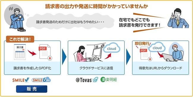 これまで、請求書はプリントアウトし、封入、投函するのが“当たり前”でした。「SMILE V 2nd Edition 販売」で請求書をデータ化し、「SMILE V 2nd Edition @Tovas連携 for 販売」「SMILE V API コネクト for 楽楽明細」でデータをクラウドにアップロードすることができます。取引先はURLから請求書をダウンロードするだけです。出力から取引先への送付を全て電子化することで、請求書発行の業務を軽減できます。