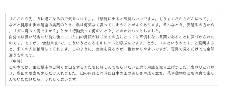 山に関する用語を覚えたら、やっぱり実物を見てみたくなるもの。本書では、書籍のなかで紹介した山の動植物や景観が見られる実用登山ガイドを新たに掲載。コースタイムの目安、見どころなどを主に初心者・初級者向けに紹介しています。