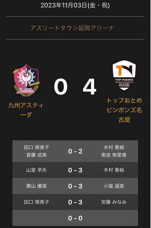 2023-11-03 一般社団法人Tリーグ ノジマTリーグ 2023-2024シーズン 公式戦 11月3日(金・祝) 九州アスティーダ vs トップおとめピンポンズ名古屋 試合結果 Tweet ノジマTリーグ2023-2024シーズン公式戦 11月3日(金・祝) 九州アスティーダ vs トップおとめピンポンズ名古屋の試合結果は4-0でトップおとめピンポンズ名古屋が勝利しました。 企業プレスリリース詳細へ PR TIMESトップへ 公式ツイッター Follow @Straightpress 最新情報をTwitterで受け取ろう! 公式フェイスブックページ 最新情報をFacebookで受け取ろう! 前の記事 一覧へ戻る 次の記事