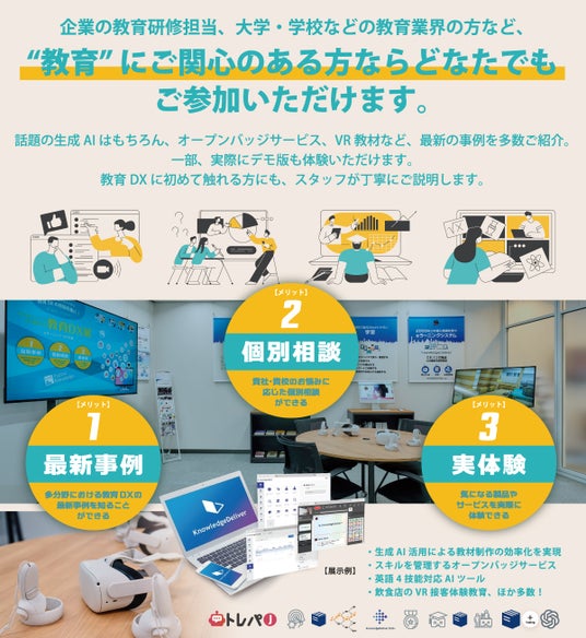 2024年夏、大阪・肥後橋駅直結のデジタル・ナレッジ西日本支社のショールームにて、eラーニング・ラボ大阪「教育DX展」をオープンいたしました。本常設展では、話題の生成AIによる問題生成や、VR技術を用いた教材について実際にデモを体験いただけます。