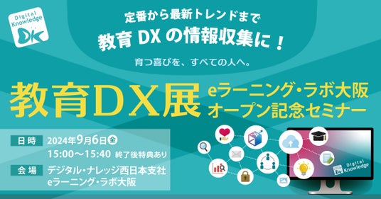 1995年創業のeラーニング専門ソリューション企業、株式会社デジタル・ナレッジ(本社:東京都台東区、西日本支社:大阪府大阪市 代表取締役社長:はが弘明)は、9/6(金)、eラーニング・ラボ大阪「教育DX展」オープン記念セミナーをデジタル・ナレッジ西日本支社にて無料開催いたします。(https://www.digital-knowledge.co.jp/archives/38744/?pr)