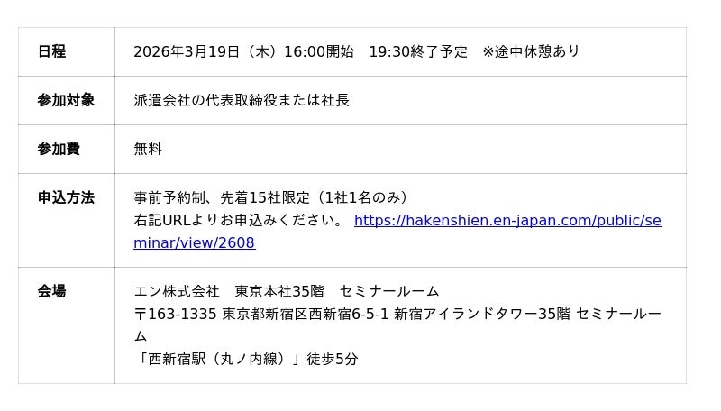 エン株式会社(本社:東京都新宿区、代表取締役会長兼社長:越智通勝)は、2026年3月19日(木)に派遣会社の代表限定の「派遣ビジネス交流会」を開催いたします。今回のテーマは「社長が本音で語り合い、社内組織を強くする一手を持ち帰る ~社員教育/評価・報酬/幹部育成・マネジメント/定着・活躍~」。派遣会社の代表の皆様は是非ご参加ください。