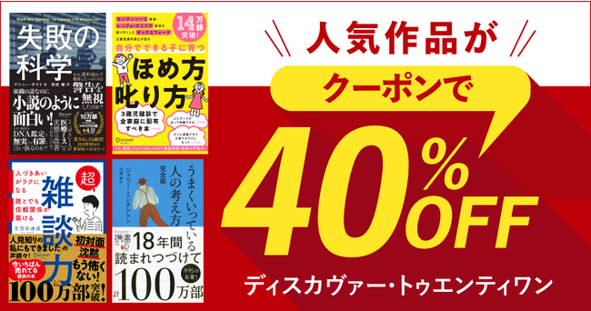 株式会社ディスカヴァー・トゥエンティワン(本社:東京都千代田区、取締役社長:谷口奈緒美)は2023年8月22日から8月29日までの8日間、楽天Koboにてディスカヴァーの電子書籍全タイトルが40%オフになるクーポンを配布しています。