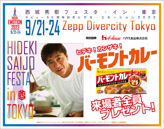 デビュー50周年を迎え類まれな歌唱力が再評価されている西城秀樹、先日発表された9月21日から24日までZEPP DIVERCITY TOKYOで開催される「西城秀樹フェスタ・イン・東京~ヒデキ・エモーション2022~」にてハウス食品「バーモントカレー(小箱)」が入場者全員にもれなくプレゼントされる。1973年から1985年まで出演したテレビCMは、カレーが国民食と言われるまでに日本人に愛され、食文化として定着させた。キャッチコピー「リンゴとハチミツとろ~りとけてる」と「『ヒデキ・カンゲキ!』は今でも多くの人の頭の中に刻み込まれているワードで、日本で最も愛されているカレーの一つと言っても過言ではない。まさにヒデキフェスタに欠かせないプレゼントとなった。