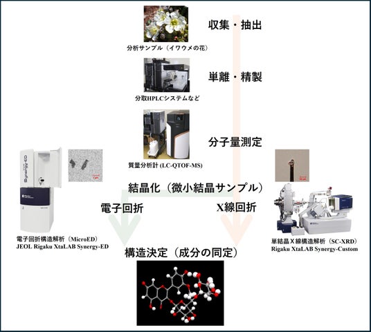 独立行政法人国立科学博物館(館長:篠田謙一) の連携大学院生の平野日向(東京農工大学 大学院連合農学研究科)、菊池貴(リガク・ホールディングスのグループ会社である株式会社リガク プロダクト本部 アプリケーションラボ)、榊原風太(アステリズム合同会社 研究開発支援事業部 技術顧問)、村井良徳(植物研究部 研究主幹)らは、微量成分分析法の開発により、植物体が小さく、許認可や倫理的な面からも研究用のサンプルの確保が難しい高山植物において10種以上のフェノール化合物配糖体の構造決定に成功しました。具体的には、イワウメ科高山植物イワウメのわずか2グラムの花から成分を単離して結晶化させ、単結晶X線構造解析(SC-XRD)や電子回折構造解析(MicroED)などの分析手法を適宜利用することにより、各含有成分を構造決定することに成功しました。高山植物を含む野生植物において、これほど微量のサンプルから多数の成分構造を決定したことは先駆的な研究例になります。これは、植物の化学成分のみならず、理学、農学、薬学など幅広い分野における未活用資源の探索研究に応用できる技術です。本研究成果は、2026年2月22日に、化学分野の国際誌「Journal of Molecular Structure」にオンライン掲載されました。さらに関連技術を用いた研究成果に関しても、生物化学分野の国際誌「Biochemical Systematics and Ecology」および農業産業分野の国内誌「アグリバイオ」に掲載されました。