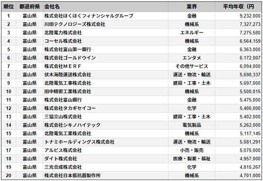 株式会社SalesNow(本社:東京都渋谷区、代表取締役:村岡功規、以下「当社」)は、国内540万社の企業情報を完全網羅した日本最大級のデータベース「SalesNow DB」より、上場企業を対象に富山県に本社を置く企業の平均年収データを集計・分析し、「平均年収ランキング」として公開いたしました。