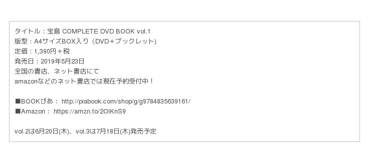 ぴあ株式会社より、5月23日(木)より、『宝島 COMPLETE DVD BOOK』全3巻を刊行開始することが決定いたしました。