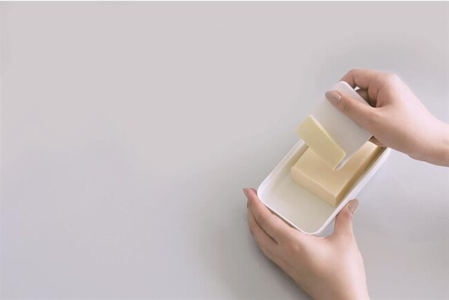 フタの裏に収納された付属のカッターで使うときにちょうど良い薄さに簡単に切り分けられます。乾燥やにおい移りがしにくいパッキン付き。バターが付きにくいので洗う手間が省けます。