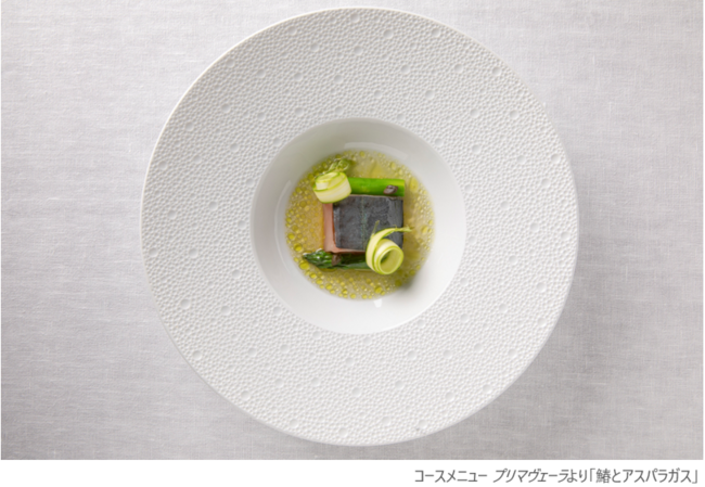 エグゼクティブシェフ ルカ・ファンティンがこの時期コースメニューで描くのは、眠りから覚めた生物が再び活動を始める、まさに生命力あふれる春の躍動感を、香り、味、色彩で伝えるその名も「プリマヴェーラ」です。その力強さをもっとも表現しているのは「鰆とアスパラガス」です。― 駿河湾を泳ぎ周り、淡白さと上品な甘みをもった鰆を炭火で炙ります。スモーキーな香りを十分に纏い、テーブルまで運ばれた鰆は、トマト、オリーブ、ケッパーなど地中海の野菜やハーブで作った自家製のブロードを注がれ、お皿の上で再び色味も鮮やかに蘇ります。 春風のようなさっぱりとした味わいのひと品です。一方、芽吹きの春を伝えるお料理は、ホワイトアスパラガスを使ったリゾットです。「北イタリアの地中で力強く育ったホワイトアスパラガスは野性味に溢れ、苦みがあります。それを食べると幼少期の春を思い出します」とルカ・ ファンティンは語ります。敢えて苦みのある国産ホワイトアスパラガスと甘味が凝縮されたホワイトアスパラガスの2種を使い、バランスのとれたうま味を感じるリゾットで北イタリアの春の恵みを美しく再現します。