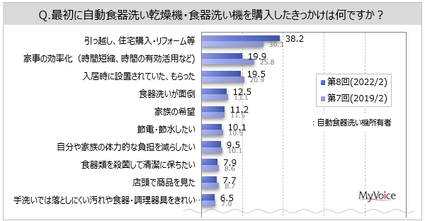 自動食器洗い機購入のきっかけは(複数回答)、「引っ越し、住宅購入・リフォーム等」が所有者の38.2%、「家事の効率化」「入居時に設置されていた、もらった」が各2割となっています。