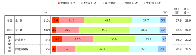 在宅勤務による自身のパフォーマンスは、評価関与者(管理職)では「向上」が「低下」を上回っているのに対し、非関与者(非管理職)では逆の結果となった。