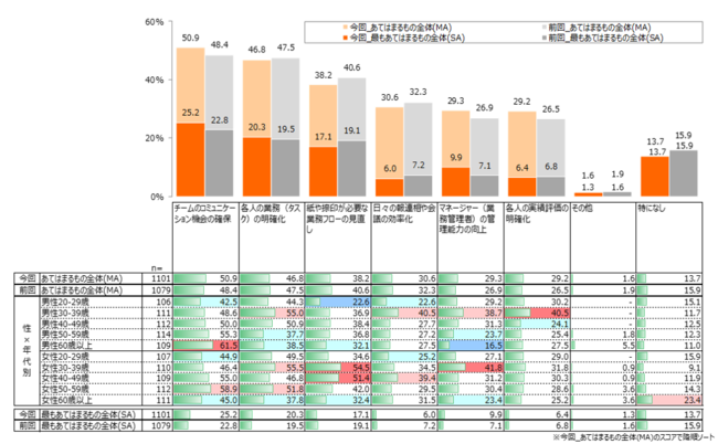 男女・年代別では、男性30代で「各人の実績評価の明確化」、男性60代で「チームのコミュニケーション機会の確保」、女性では30代・40代で「紙や捺印が必要な業務フローの見直し」が、他の属性に比べて高い。