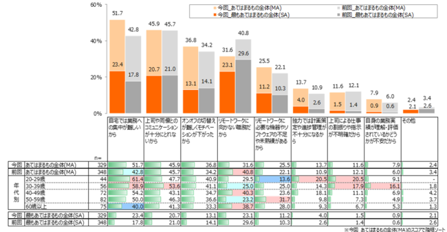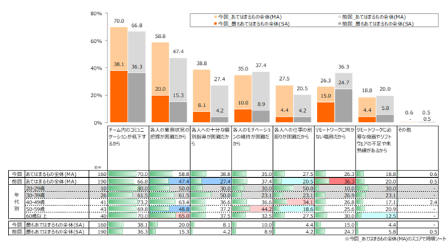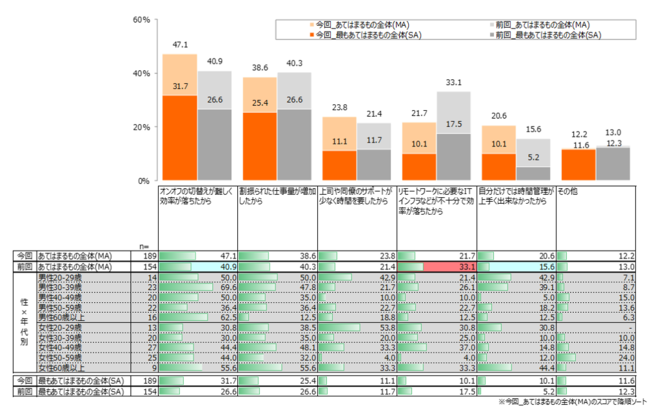 一方、50代では「自宅では業務への集中が難しいから」が前回の29.1%から今回は50.0%に大きく増加。また60代では、「リモートワークに必要な機器やソフトウェアの不足や未熟練があるから」が前回の10.0%から今回は28.0%に大きく増加した。