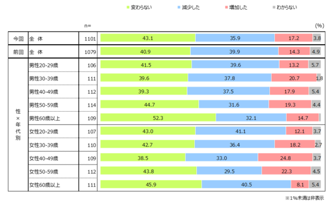 ■在宅勤務による労働時間の変化は「変わらない」が43.1%、「減少した」が35.9%。「増加した」と感じている割合は40・50代の女性が、他の属性よりも高い傾向。