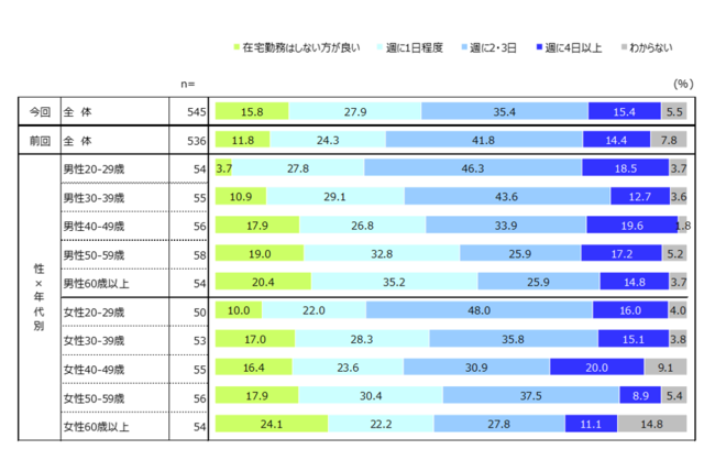 男性50代以上では「在宅勤務はしない方が良い」「週に1日程度」を合わせると50%を超え、緊急事態宣言解除後の実際の実施率(詳細は2頁)と同程度の数値となった。多くの会社で管理職層を担うこの年代の意向が、実際の運用に反映された可能性がある。