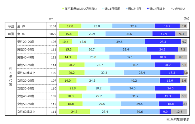 ■自身のパフォーマンス最適化に向けて適切な在宅勤務の頻度は、前回同様「週に2-3日」(32.9%)が最も多かったものの、その割合は減少した。男女とも若年層(20代・30代)で「週2-3日」「週4日以上」が多い結果となった。