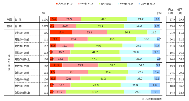 ■在宅勤務による自身のパフォーマンスは、前回に比べて「向上した」とする割合が増加。20代の男性では「向上した」とする割合が半数を超えた一方、40代以上では男女とも「低下」が「向上」を上回った。同居家族の有無による結果の差は年代別ほど大きくなく、世代間の格差が明確に出ている。