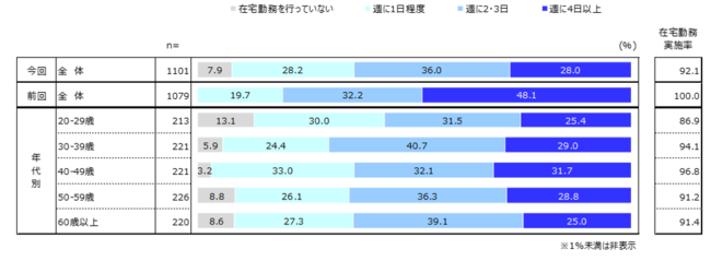 ■前回(2020年)と比べて、2021年の緊急事態宣言中(7~9月)の在宅勤務実施率は、全体で92.1%と大きな変化はないものの、「週4日以上」は28.0%と大幅に減少。