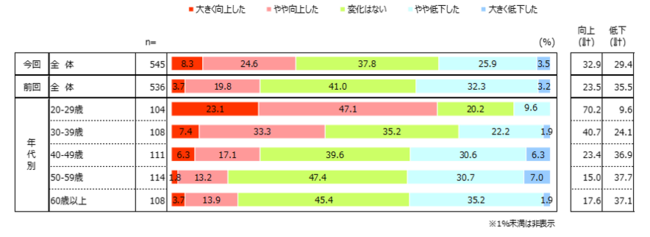 在宅勤務によるチームへのパフォーマンスは、前回に比べて「向上した」の割合が増加し、「低下した」の割合が減少した。前回同様、若年層(20代・30代)は「向上した」の 割合が高く、世代間格差が見て取れる。