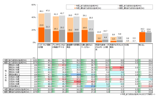 ■在宅勤務を円滑に行うための「家庭内環境」の課題としては、前回同様「インターネット環境の改善(46.1%)」「プリンタやモニタなどの機器が不十分(41.3%)」「通信費や光熱費の負担(39.5%)」の順だった。