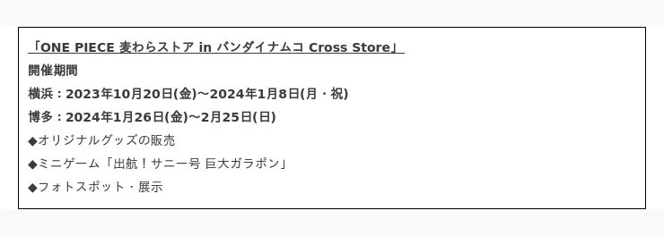 株式会社バンダイナムコアミューズメントは、『ONE PIECE(ワンピース)』公式グッズショップ「ONE PIECE 麦わらストア」のポップアップイベント「ONE PIECE 麦わらストア in バンダイナムコ Cross Store」を「バンダイナムコ Cross Store 横浜」で2023年10月20日(金)から2024年1月8日(月・祝)まで開催します。横浜での開催終了後は、2024年1月26日(金)~2月25日(日)に博多で開催します。今後の展開はイベント特設サイトやX(旧Twitter)などでお知らせします。