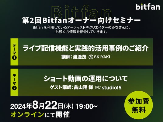 株式会社SKIYAKI(本社:東京都渋谷区、代表取締役:小久保知洋、以下「SKIYAKI」)は、2024年8月22日(水)に、誰でも無料でクリエイター活動に必要なサービスを利用できる、新時代のファンビジネスを支えるプラットフォーム「Bitfan」を利用中のオーナーの皆様に向けた無料オンラインセミナーを開催いたします。