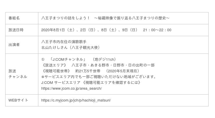 株式会社ジェイコム東京 八王子・日野局(J:COM八王子・日野、所在地:東京都八王子市、局長:海老澤孝一)は、2020年の八王子まつりが新型コロナウイルス感染症の蔓延防止のため中止となったことを受け、映像で八王子まつりをめるよう、8月1日(土)午後9時から特別番組『八王子まつりの話をしよう! ~秘蔵映像で振り返る八王子まつりの歴史~』を放送いたします。