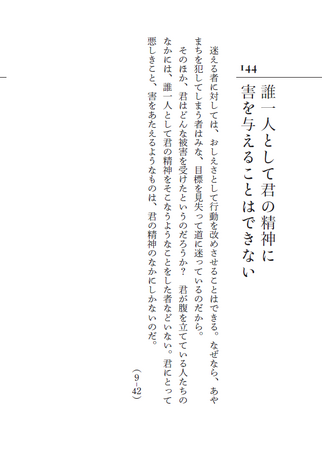 本書では、『自省録』のうち、全体で487章ある長短さまざまな文章から、現代人にとって意味をもつと思われる180章を厳選して翻訳しています。