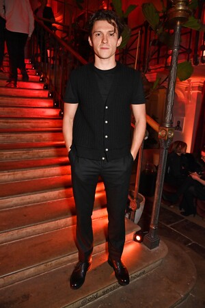 トム・ホランドは、ブラックのウールベストとブラックのTシャツに、ブラックのパンツとブラックのダービーシューズを合わせました。