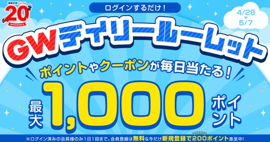 無料の会員登録をするだけで、新規会員様には今だけ限定で200ポイント付与。GWデイリールーレットの景品と、両方ゲットできるお得な期間は今だけです!