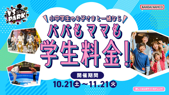 株式会社バンダイナムコアミューズメントが運営する屋内“ヤバすぎ”アクティビティ施設『VS PARK』では、2023年10月21日(土)から11月21日(火)までの期間、小学生または中学生のお子さまと一緒に来店すると、保護者(18歳以上・学生除く)が一般料金よりお得な学生料金でご利用できる「パパもママも学生料金!」キャンペーンを開催します。指定のクーポンを提示すると、小中学生のお子さま1名につき、大人(保護者)最大5名までが学生料金に!この秋は、おじいちゃん・おばあちゃんや、ママ友を誘って、学生に戻った気分でVS PARKで思いっきりはしゃいじゃおう!