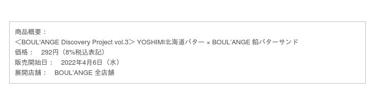 第3弾は、北海道のおいしいもの作りにこだわり、北海道の味を届けるレストランを全国に展開している「YOSHIMI(ヨシミ)」が提案する「YOSHIMI北海道バター」と新たにタッグを組み、BOUL’ANGEの人気商品である「餡バターサンド」の肝となるバターに使用しました。