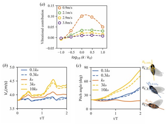 図:振動安定化の飛行速度依存性(a)と翅ヒンジの剛性依存性:全身速度(b)、ピッチ角(c)