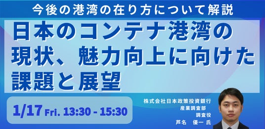 JPI(日本計画研究所)は、株式会社日本政策投資銀行 産業調査部 調査役 芦名 優一 氏を招聘し、日本のコンテナ港湾の現状 及び 魅力向上に向けた課題と今後の展望について詳説いただくセミナーを開催します。