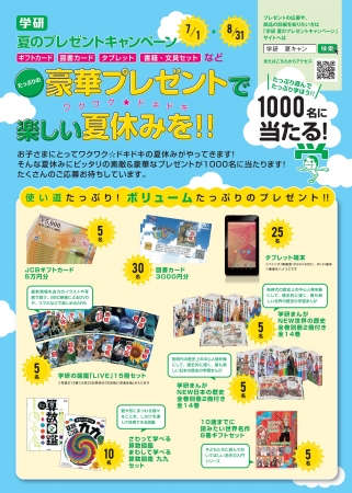 株式会社 学研ホールディングス(東京・品川/代表取締役社長:宮原博昭)は、ワクワク☆ドキドキのお子さまの夏休みにピッタリの豪華なプレゼントが1000名様に当たる「学研 春のキャンペーン」を7月1日(土)からスタートいたします。