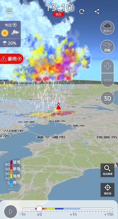 アプリ「3D雨雲ウォッチ』で確認できる雨雲イメージ