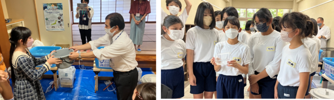 ヒラメ専用の水槽の設置から少しの期間を空けて、いよいよヒラメを受け入れる日がやってきました。それぞれの学校で、NPO養殖振興会代表理事の斉藤先生がヒラメの育て方や注意点についてお話をされ、児童たちは改めて命を育てる・預かるということについて気を引き締めているようでした。