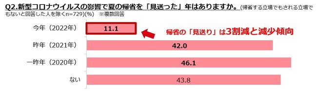 ・感染拡大の影響による帰省見送りは、過去2年は40%以上だったが、今年は3割以上減って11%に。