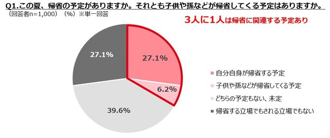 ・自身が帰省する人は27%、子供などが帰省してくる人は6%。3人に1人は帰省に関連する予定あり。
