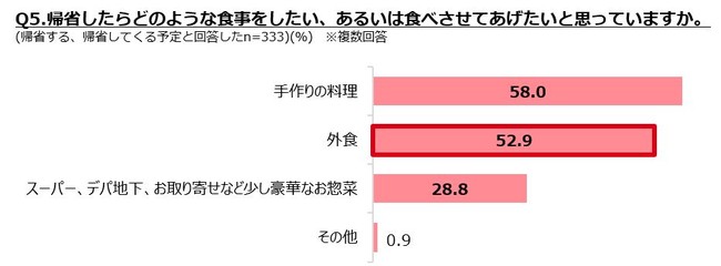 帰省時の食事については、手作りの料理で楽しむ人が多い一方、外食を楽しみにしている人も半数以上となりました。