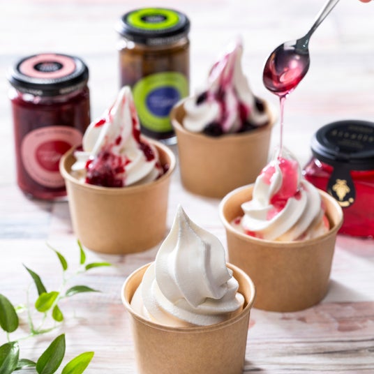 また、ソフトクリームをさらに美味しくするために、アイバレーの赤いはちみつやノースファームストックのジャムなど、選べるトッピングもご用意しております。