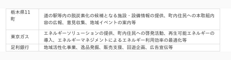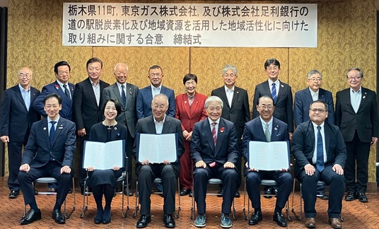 栃木県内の11町(以下「栃木県11町」(*1))、東京ガス株式会社(社長:笹山 晋一、以下「東京ガス」)、株式会社足利銀行(頭取:清水 和幸、以下「足利銀行」)は、このたび、栃木県11町にある道の駅等(*2)の脱炭素化および地域資源を活用した地域活性化に向けた取組に関する合意書(以下「本合意書」)を締結しました。