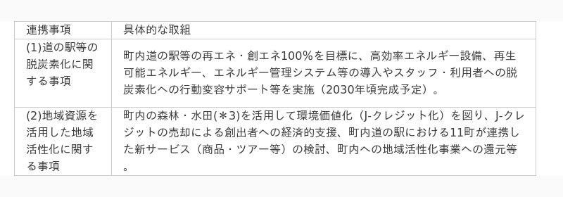 本合意書の締結はその取組の一環であり、地域交流拠点である道の駅等の脱炭素化と、各町が所有する資源の活用を図ることで、地域住民と観光客への環境対策の取組の理解促進ならびにカーボンニュートラル社会の実現への貢献を目指します。