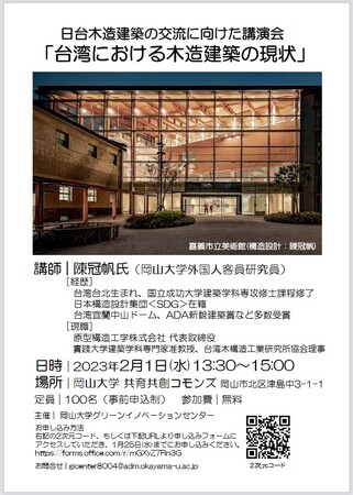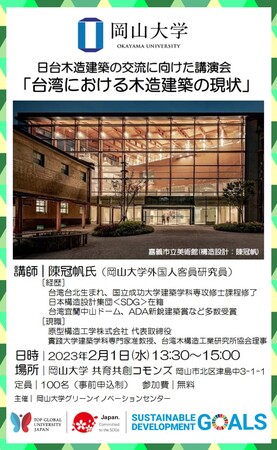 国立大学法人岡山大学(本部:岡山市北区津島中、学長:槇野博史)のグリーンイノベーションセンターでは、2023年2月1日(水)に日台木造建築の交流に向けた講演会「台湾における木造建築の現状」を、本学津島キャンパスの新設された岡山大学共育共創コモンズにて開催します。