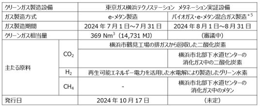 なお、2024年8月から、横浜市下水道河川局北部下水道センターの再生水と消化ガスを、水素とe-メタン製造用の原料として活用する実証*4を開始しており、今後、これらを原料にしたe-メタンやバイオガスとの混合ガスについても、クリーンガス相当量としての認証を受け、活用することを予定しています。
