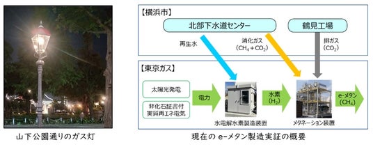 横浜市(市長:山中 竹春)と東京ガス株式会社(社長:笹山 晋一、以下「東京ガス」)は、このたび、クリーンガス証書制度に基づき、「東京ガス横浜テクノステーション メタネーション実証設備」(以下「メタネーション実証設備」)で製造したe-methane(以下「e-メタン」)を対象に発行されたクリーンガス証書の環境価値の移転に合意し、山下公園通りに設置されているガス灯に活用します。