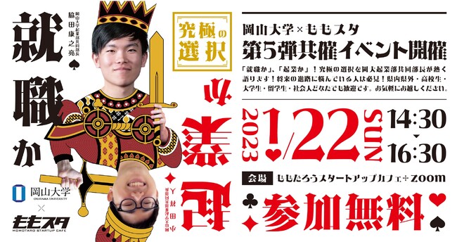 国立大学法人岡山大学(本部:岡山市北区津島中、学長:槇野博史)の岡山大学起業部では、おかやま・スタートアップ支援拠点運営委員会ともに、2023年1月22日(日)に【岡山大学起業部×ももスタ共催イベント第5弾】岡大起業部共同部長に聞く「就職か、起業か」をJR岡山駅前のももたろう・スタートアップカフェ(岡山市北区)とオンライン(zoom)のハイブリッドで開催します。
