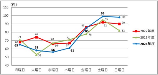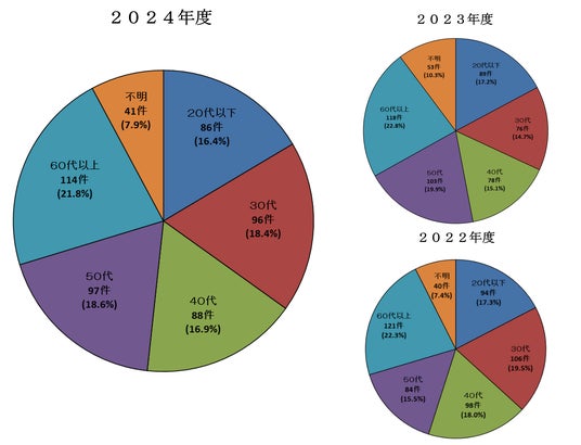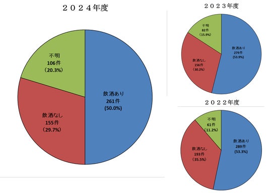 今年度の特徴として、月別では11月~2月の期間において、いずれの月も昨年度を上回る発生件数となりました。曜日別では金土日に多く発生し、時間帯別では深夜の発生件数が多くなっています。また、暴力行為の加害者の50%(522件中261件)に飲酒が認められた一方、飲酒を伴わない場合にも事例が確認されており、飲酒の有無にかかわらず暴力行為は多数発生しております。加害者の年齢に偏りはなく、幅広い年代に分布しております。