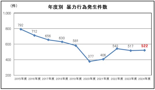 2020年度から2021年度にかけては、新型コロナウイルス感染症の流行を機に、暴力行為の発生件数は一時的に減少しましたが、再び2022年度より大きく増加に転じ、2024年度においても同水準で推移しております。